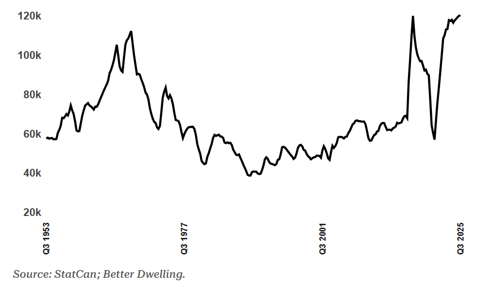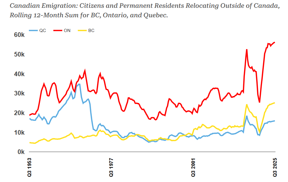 加拿大首次出现的人口负增长,常被归咎于临时居民的撤离,但这一说法忽略了更严峻的结构性问题 —— 本国公民外流同样创下历史纪录。加拿大统计局(StatCan)数据显示,2025 年第三季度,公民或永久居民移居海外的 “出境移民” 规模激增;过去一年的出境人数突破历史极值,而加拿大历史上仅出现过两次类似高峰。三次异常外流浪潮指向同一个根源:房地产泡沫引发的资本错配危机。