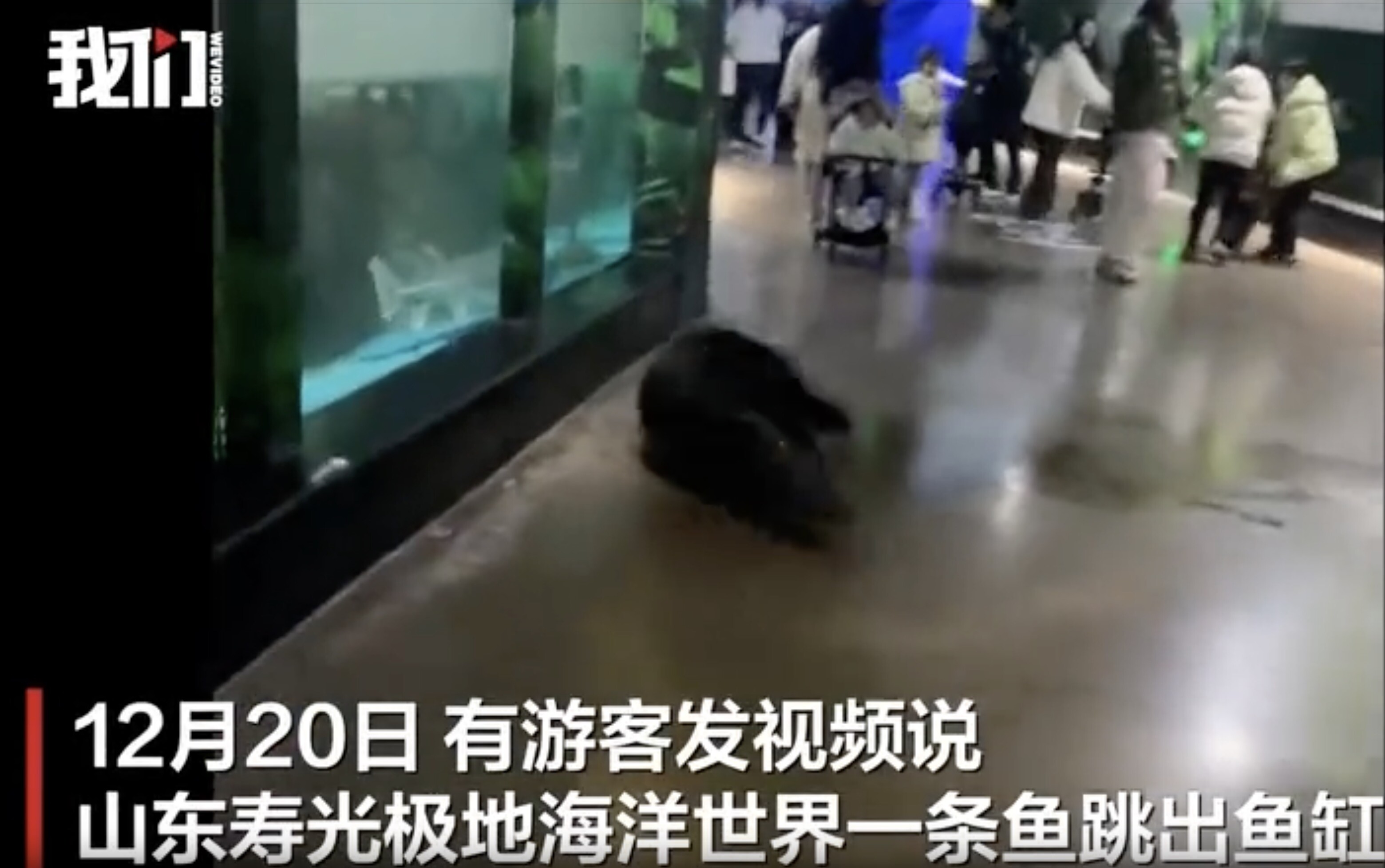 12月20日,有游客发视频说,山东寿光极地海洋世界一条巨骨舌鱼跳出鱼缸,鱼在地板上摆动身体,场馆工作人员控制未果摔倒。