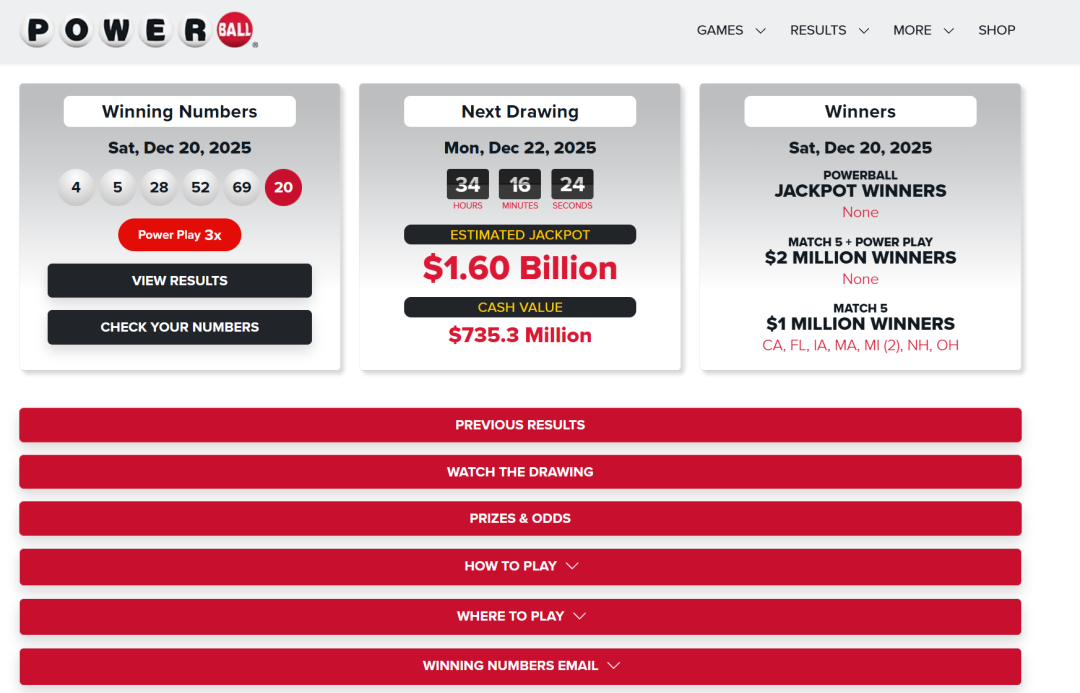 16亿美元(预计),强力球,2025年12月22日