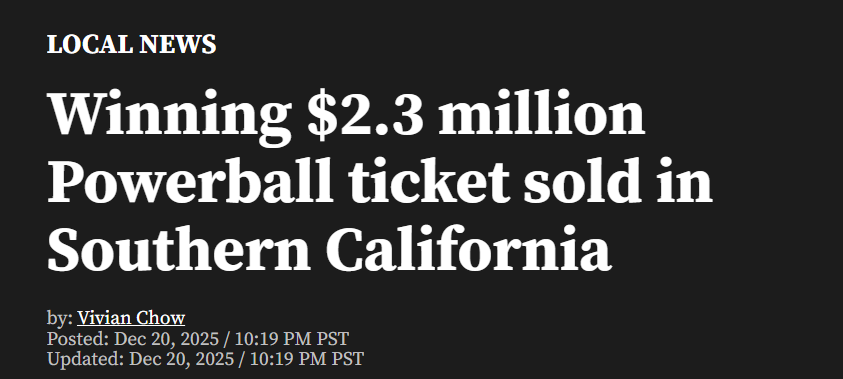 据KTLA新闻12月21日报道 一名幸运的南加州居民在12月20日周六晚间的强力球(Powerball)开奖中赢得了超过230万美元的奖金。新闻报道截图