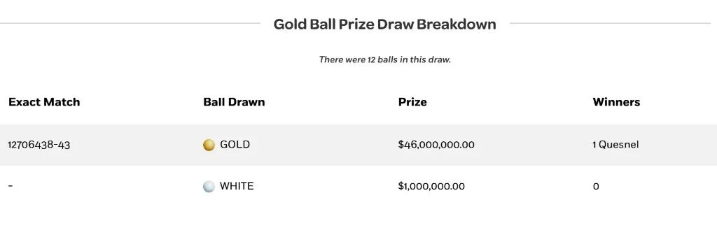 周日,BC省彩票公司表示,奎斯内尔市的一位购买了 Lotto 6/49 金球头奖彩票的人士,在周六晚的全加国抽奖中,通过匹配全部 10 个抽奖号码,赢得了 4600 万加元的奖金。