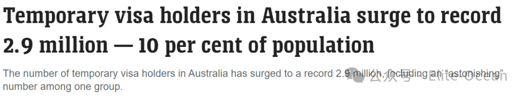 澳大利亚的临时签证持有者数量飙升至创纪录的292.5万人,工党政府被指责对这一持续增长的群体毫无管控计划,该群体正给本国本已紧张的住房市场带来压力。内政部数据显示,目前在澳洲,国际学生、新西兰公民、数量“惊人”的过桥签证持有者以及等待遣返的庇护申请失败者,目前已占澳洲总人口的10%。