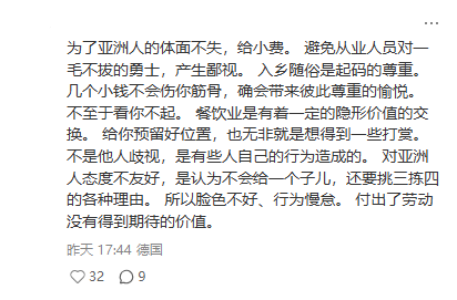 也有人劝 为了体面得给:“为了亚洲人的体面,给小费… 几个小钱换彼此尊重,不然服务员会鄙视你。不是人歧视你,是你一毛不拔让人慢待”