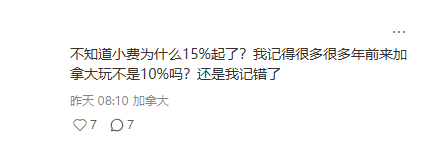 有网友先发出灵魂疑问:“不知道小费为什么 15% 起了?我记得很多很多年前来加拿大玩不是 10% 吗?还是我记错了?”