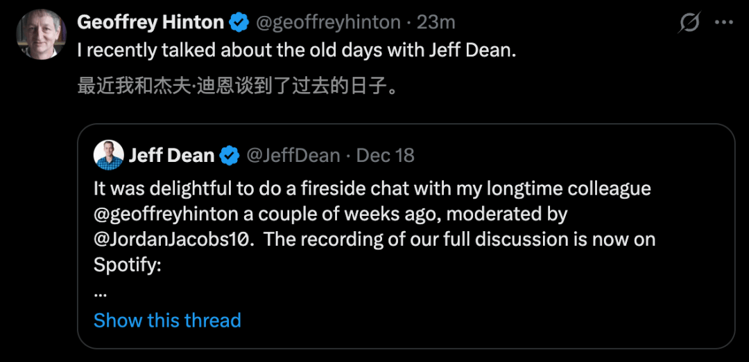 AI教父Hinton和DeepMind首席科学家Jeff Dean,两位AI圈关键人物,曾经合作多年的老友聚在一起。