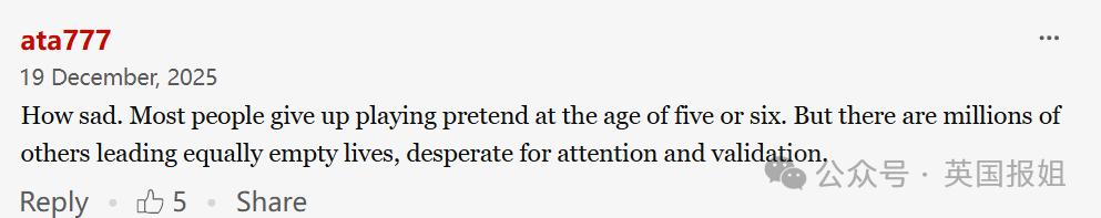 “好可怜,多数人在五六岁时就不玩这种过家家游戏了,没想到数百万精神空虚的人,靠这样博眼球、寻求被关注。”