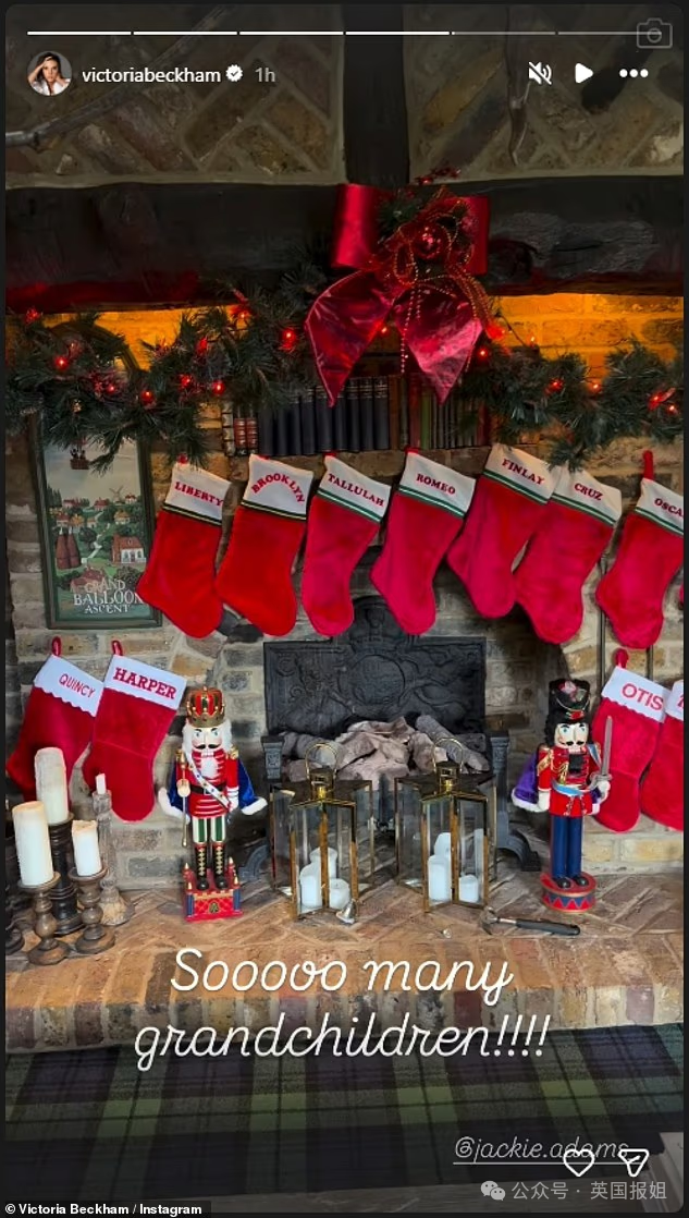她在社交媒体上发布了一张照片,照片中她的父母(大布的姥姥姥爷)在家中壁炉里摆满了圣诞袜,文字写着“我们有这么多的孙辈!!”,——其中一只圣诞袜,是留给布鲁克林的(但没有他老婆...)。