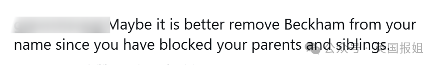 “既然你已经拉黑家人,那是时候把贝克汉姆这个姓氏从你名字中拿掉了。”