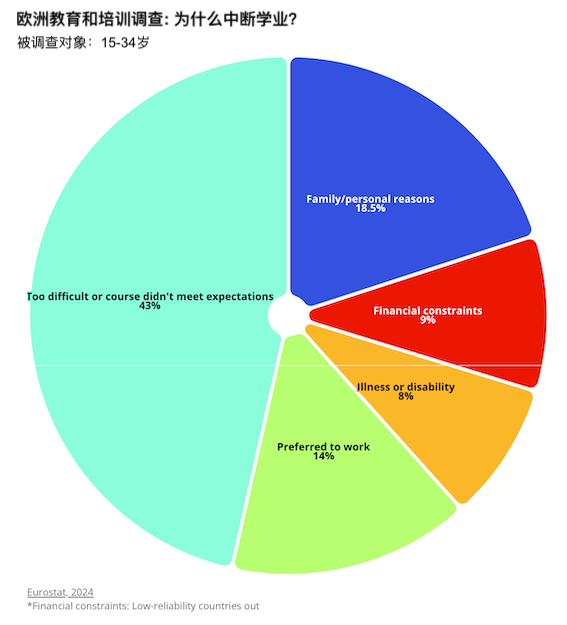 欧洲统计局的数据显示,43%的人称,因为学习和学习课程太难或不符合他们的期望,就退出学习和培训。高等教育中因此中断学业的比例更是高达50%。