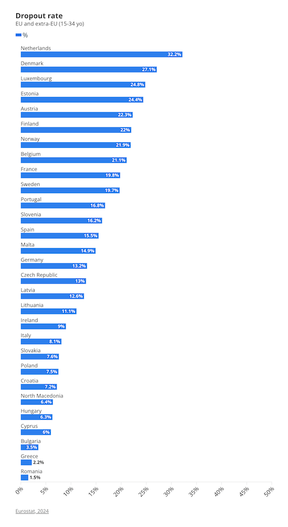 欧盟各国的辍学率各不相同。荷兰的辍学比例名列前茅,32%的学生和受训者至少辍学过一次。丹麦紧随其后,占27%,卢森堡以25%排名第三。