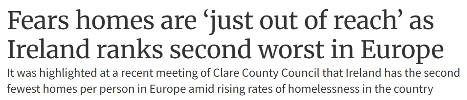在克莱尔郡议会近期会议上披露的数据显示,爱尔兰人均住房数量位居欧洲倒数第二,而无家可归者比例正持续上升。议员乔·基林指出,当前房价已“让年轻人遥不可及”,并呼吁住房部长及欧洲议员推动欧盟层面战略以缓解住房短缺危机。基林强调,爱尔兰、芬兰、德国等国无家可归现象日益严重,若欧盟能通过简化法规、优化规划流程等方式提供协助,将有效改善现状。他列举欧盟住房支持关键机制包括:国家援助规则调整、经济利益服务修订、投资欧盟计划以降低社会性住房风险等。