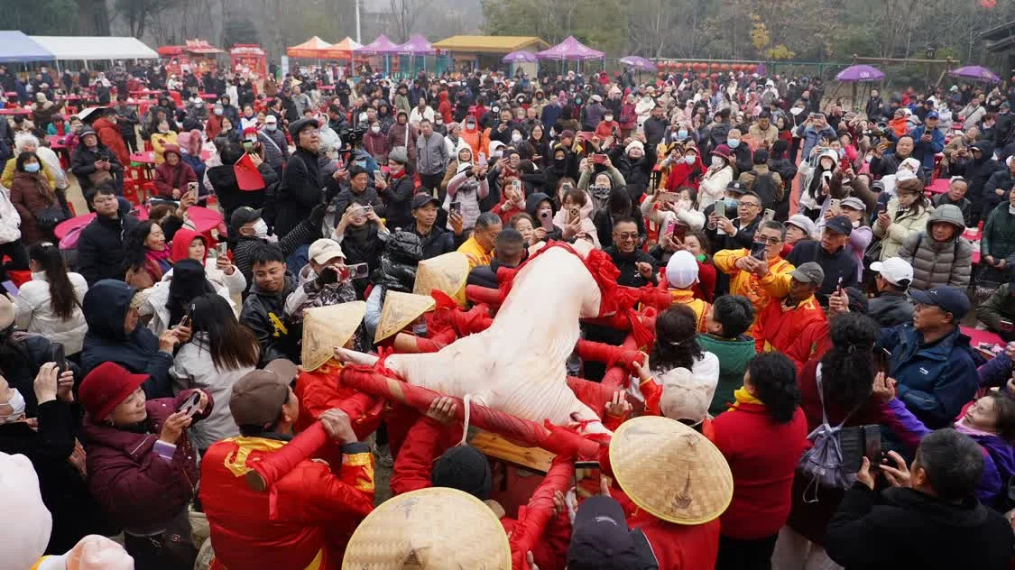 12月20日,武汉黄陂野村谷景区上演了一场“沸腾”的年猪宴,150余桌宴席、1500余人同时开席,抬着整头黑猪绕场、近二十道菜陆续登场,这场定期举办的盛宴,每人收费40元,不仅让游客直呼“找到了年味”,更让本地村民日赚2000元。
