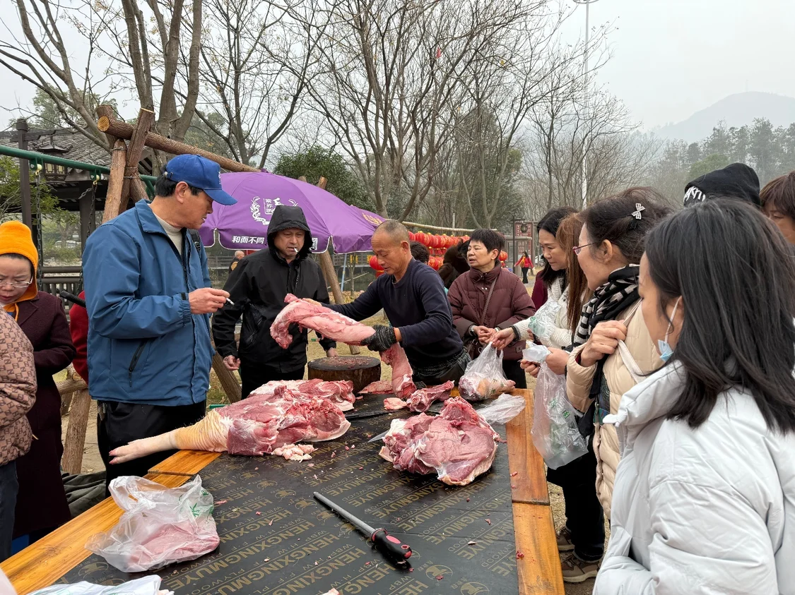 年猪宴的主角,是黄陂本地村民自养的黑猪。“这些猪都是农户吃不完的,景区统一检疫后屠宰,农户可以现场卖肉,我们不收他们一分钱。”彭先生介绍,“每头猪200斤左右,平均10多元一斤,现场能卖2000多元,卖不完的景区兜底回购。”