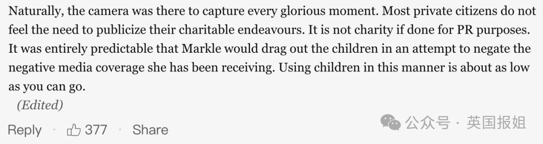 “超自然的呢,相机随时捕捉每一个荣耀的时刻。注重隐私的素人根本不会想用力宣传自己做慈善。要是为了公关宣传做的,那就不是慈善。这事儿太好解释了,梅根拖着娃出来想要平息她自己收到的那些负面媒体报道。想利用娃达到这种目的,low中之low。”