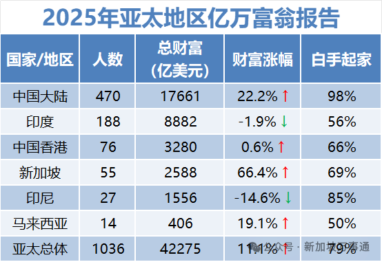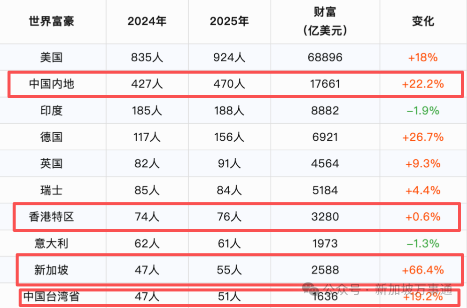 其中,亚太区亿万富豪人数从981人增至1036人,增幅居全球之首。中国内地2025年新增70位亿万富豪,目前共有470人,仅次于美国。