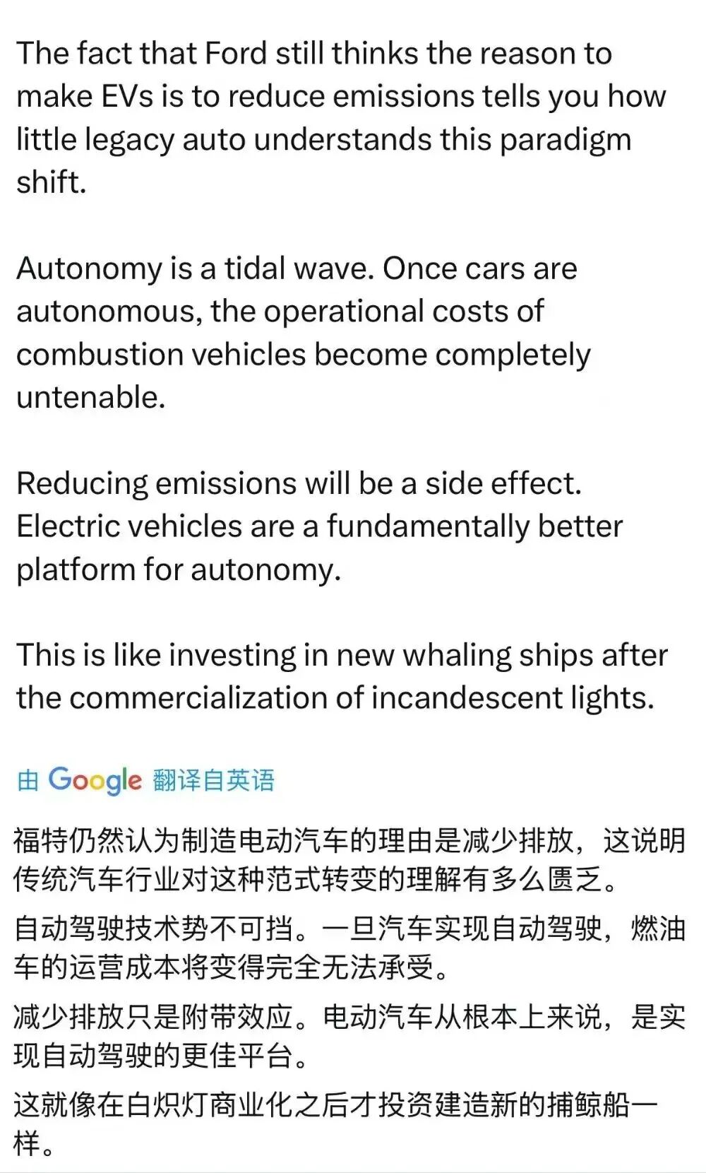 短短几句话,马斯克的态度展露无遗。在他眼里,福特的战略收缩不是理性选择,而是对行业趋势的误读,是心甘情愿沉沦于旧时代的“自杀式操作”。
