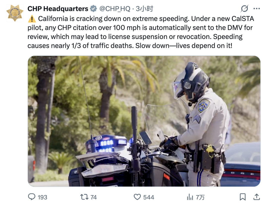 CHP局长肖恩·杜里(Sean Duryee)则强调:“时速超过100英里是一种鲁莽选择,会危及道路上每一个人。这个新计划将带来迅速后果,在他们的行为造成不可逆转伤害前将危险驾驶员移除道路。”