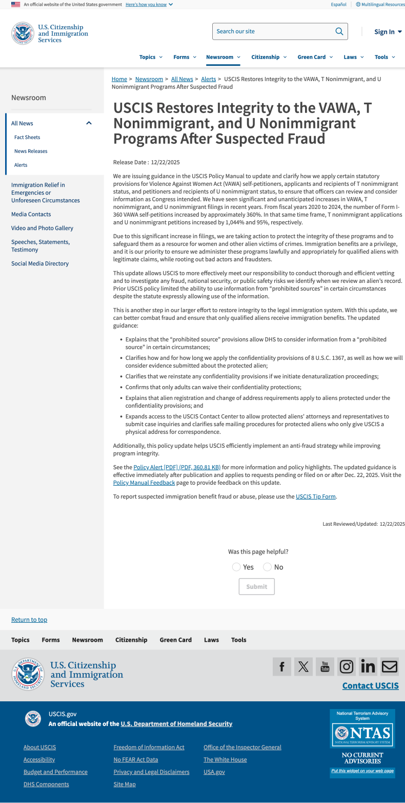 把移民局过去长期沿用的做法正式写进政策手册里,同时对VAWA法律条款怎么应用给出更详细的说明。