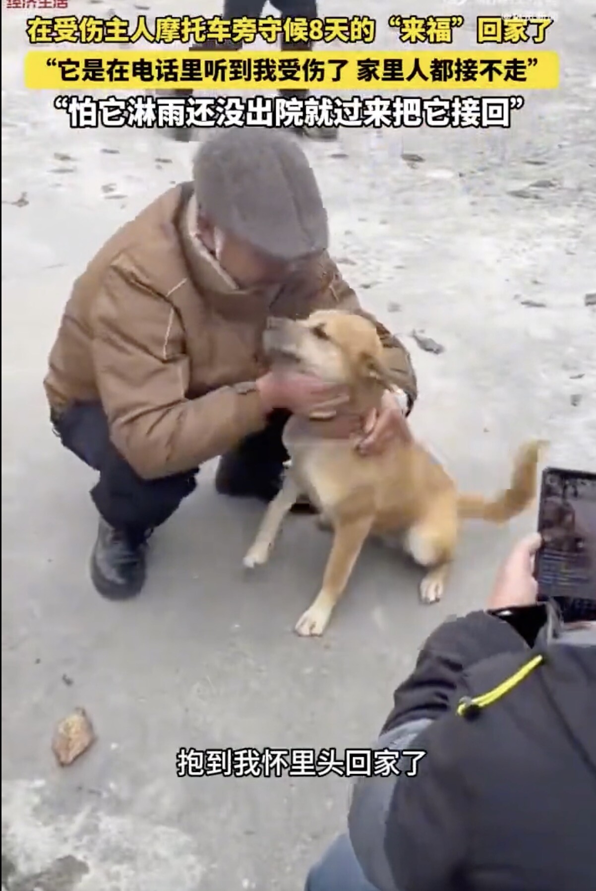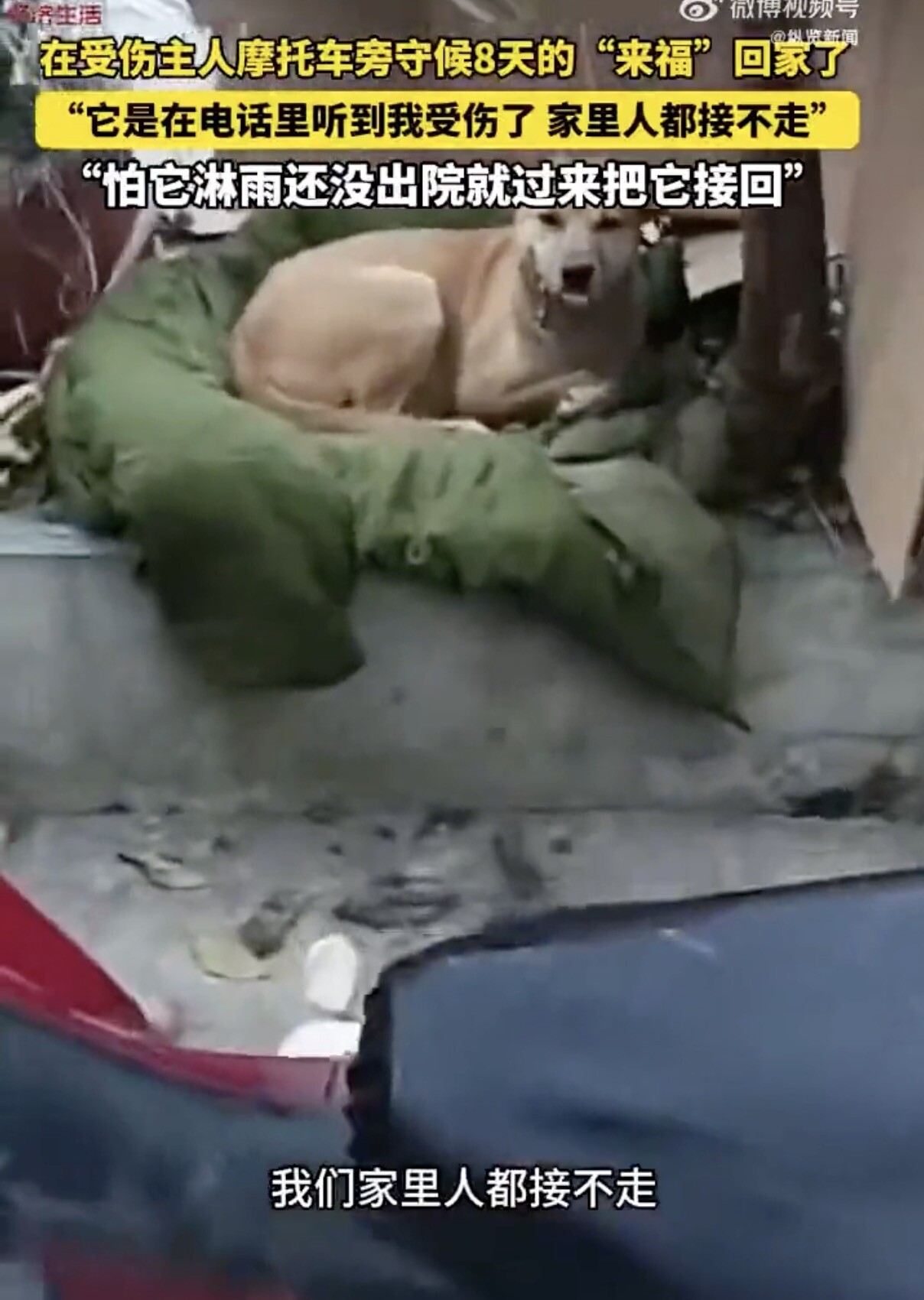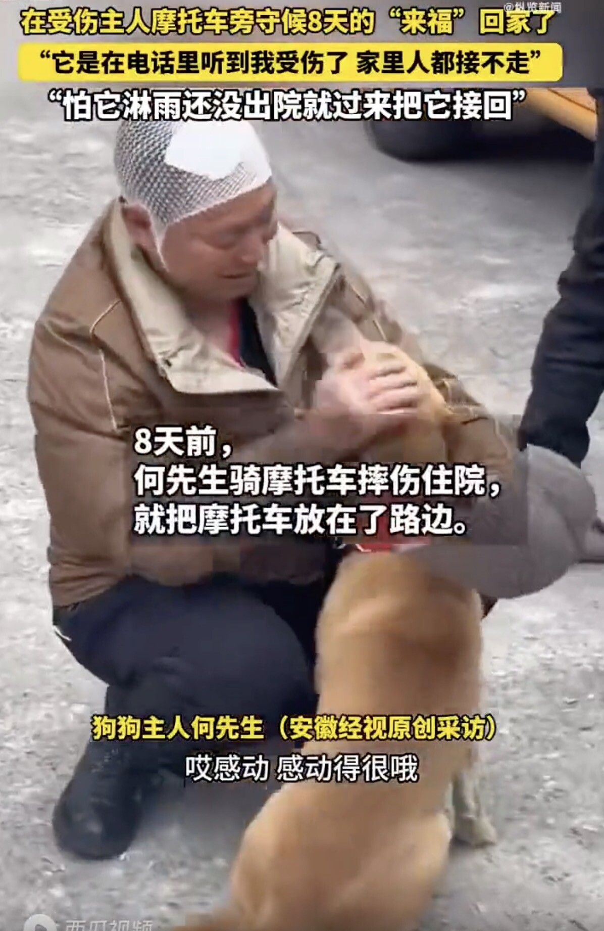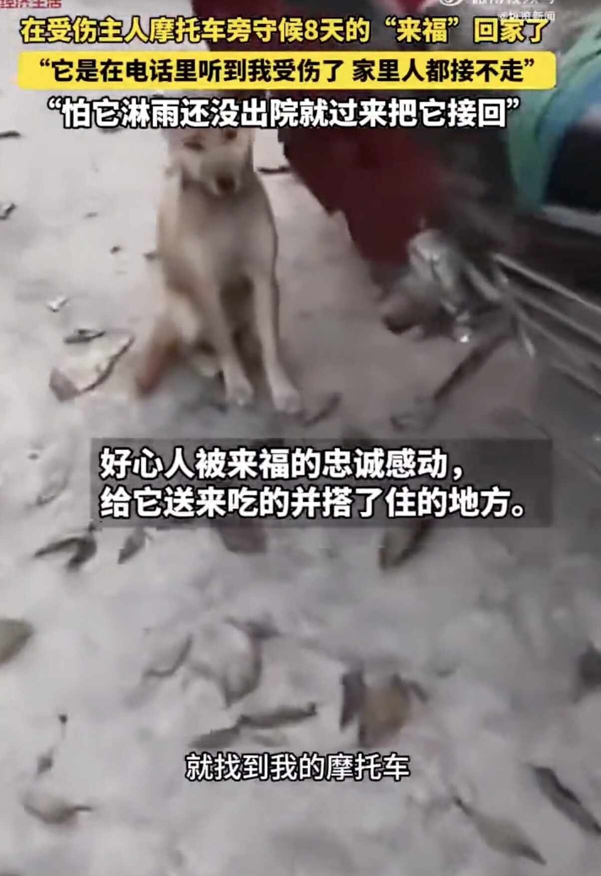 主人车祸住院 狗狗找到摩托车一守就是8天 来源:纵览新闻 于 2025年12月23日 15:17 》〉》返回首页 近日,四川绵阳平武县一只叫“来福”的狗,在主人车祸住院后,自己找到主人摩托车在旁边守候,在第8天终于被主人接回家。 拍摄这段感人故事的杨先生称,自己刚见到来福还没反应过来是找主人的,后来一直看它在这才知道是来找主人,给主人守护摩托车的,很有灵性,担心来福安全,联系到主人把它接走了。 何先生表示:“很感动,我还没出院,但是怕它淋雨过来把它先接回家。” Advertisements