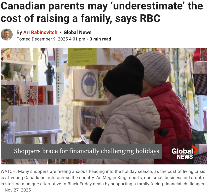 这只是加拿大皇家银行2025年家庭财务调查(家长版)的部分内容,该调查由安格斯·里德(Angus Reid)调查公司于2025年7月进行,并于周二(12月9日)发布。这项调查共有超过1500名加拿大父母参与,他们的孩子年龄在0至17岁之间,且至少有一个孩子。