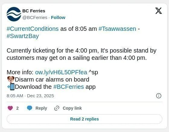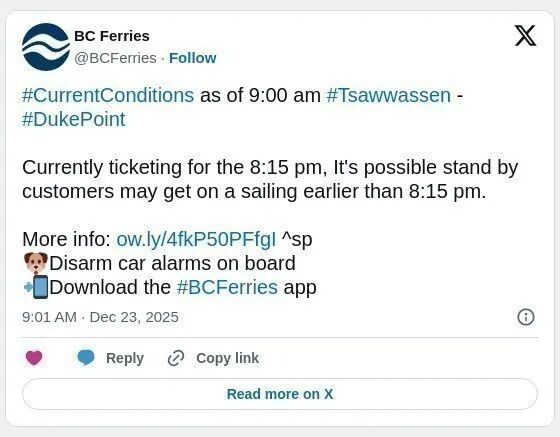 BC轮渡上午9点在社交媒体上表示,对于前往纳奈莫Duke Point的乘客,目前正在售票的航班为晚上8点15的航班,这意味着候补乘客有可能需要从早9点等到晚8点。