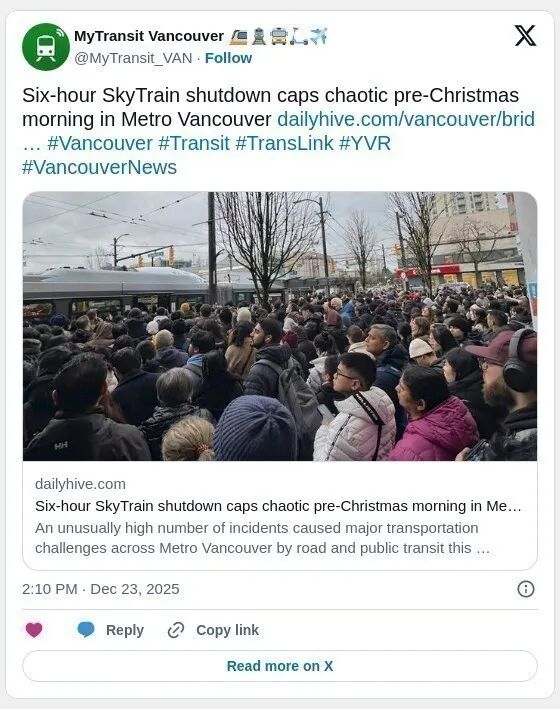 然而,由于停运影响了天车网络中最繁忙的路段——温哥华市中心线路——且正值早高峰,巴士接驳服务很快就不堪重负。