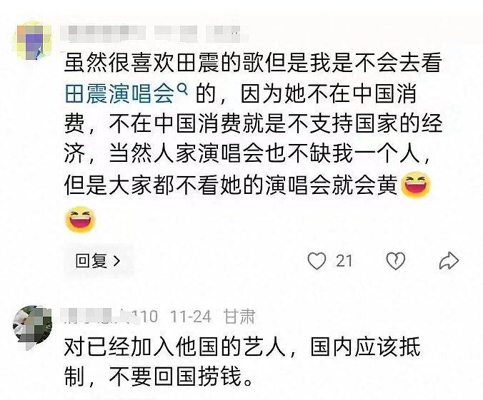 大概也是听到了这种声音,田震特地做了回复。