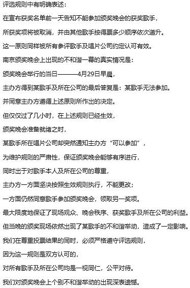 事后主办中央人民广播电台文艺节目中心负责人5月8日在北京就《中国流行歌曲榜》南京年度颁奖晚会出现的个别不和谐“插曲”接受了有关媒体的采访,并作出了声明。