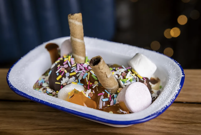 这里欢迎所有人——包括狗狗。餐厅提供素食菜肴、无酒精饮品、无麸质啤酒,还有为孩子准备的 “hoppy meals”,包括汉堡、鸡块或素食主菜任选,配菜、饮品、涂色书和铅笔。甜点也毫不含糊:巧克力酱、棉花糖、果冻、巧克力威化饼和独角兽糖针的冰淇淋圣代。