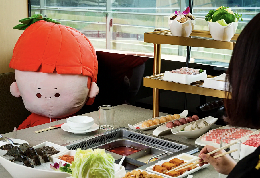这里的用餐体验充满互动与戏剧感——选择锅底、挑选食材,然后开始涮起来。孩子想多一个“玩伴”?可以向店员要一个大号毛绒玩具一起入座。