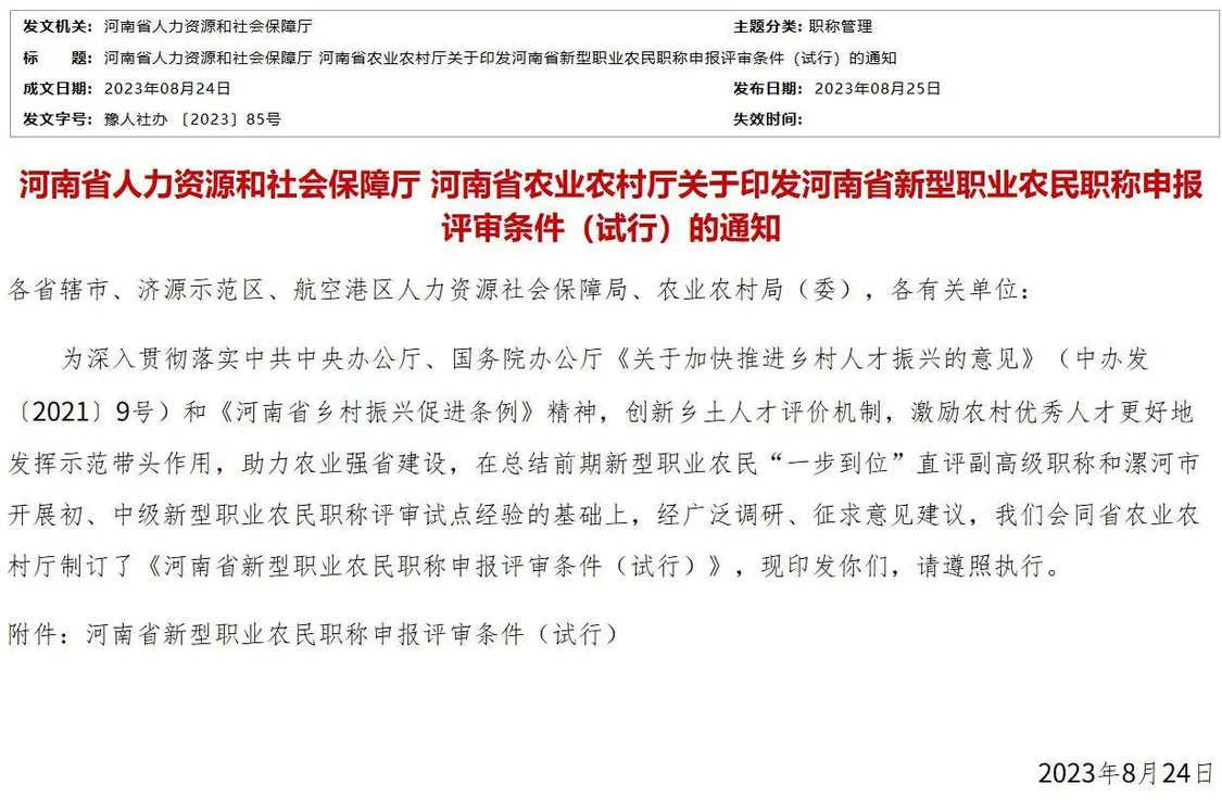 2023年8月24日下发的《河南省人力资源和社会保障厅 河南省农业农村厅关于印发河南省新型职业农民职称申报评审条件(试行)的通知》中,明确了河南省新型职业农民职称申报评审条件:新型职业农民职称隶属农业系列,层级与河南省农业系列职称基本一致,其中,初级职称名称为助理农艺师(新型职业农民),中级职称名称为农艺师(新型职业农民),副高级职称名称为高级农艺师(新型职业农民)。专业为种植业、养殖业、农产品生产加工、农业社会化服务四大类。