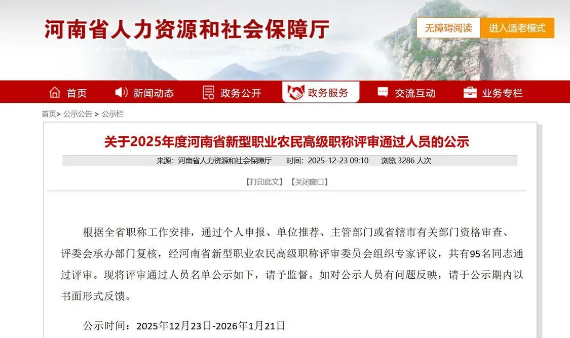 另据河南省人力资源和社会保障厅2025年12月24日发布的《关于2025年度河南省新型职业农民高级职称评审通过人员的公示》显示,今年有95人被评为高级农艺师,职称为副高级。