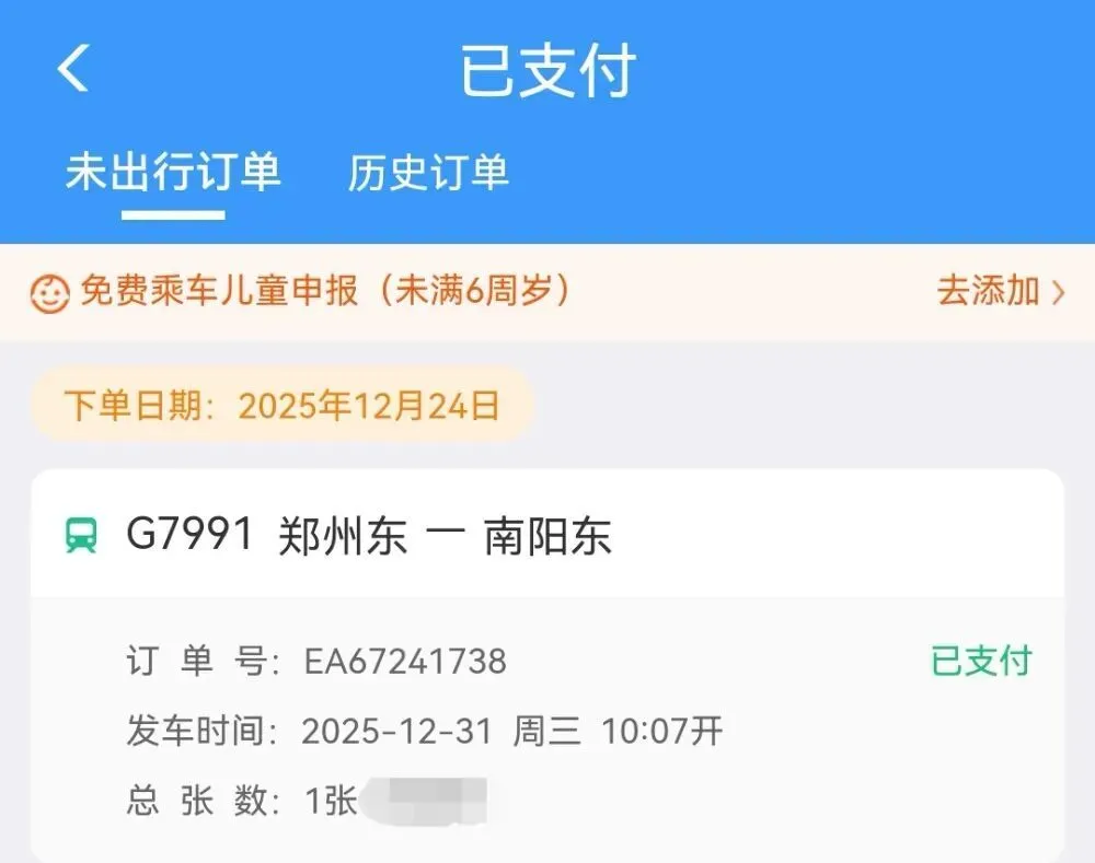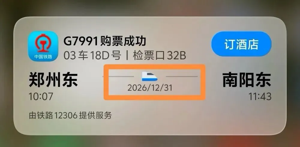 近日,有网友发帖反映,在12306平台预订2025年12月31日郑州东至南阳东的G7991次高铁票时,页面显示的乘车日期竟为“2026年12月31日”。该帖引发网友热议,有人猜测是系统漏洞,也有人调侃是“纪年法计算差异”。