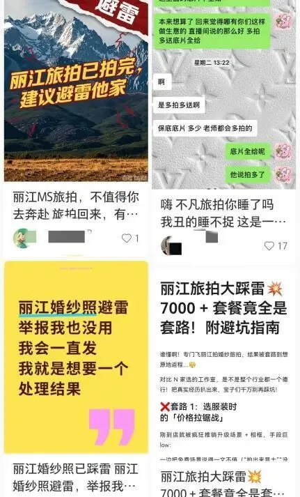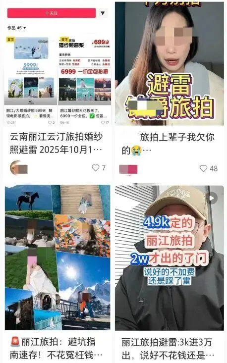 经视直播记者在小红书平台发现,丽江古城确实存在大量旅拍“避雷指南”。记者查阅这些“避雷帖”后发现,其内容主要涵盖三个方面:一是揭露消费陷阱,指出商家设置多种隐性收费项目;二是批评摄影师技术不精湛或后期修图效果欠佳;三是部分业内人士发布的“避雷帖”,实则为一些店铺进行的商业推广。