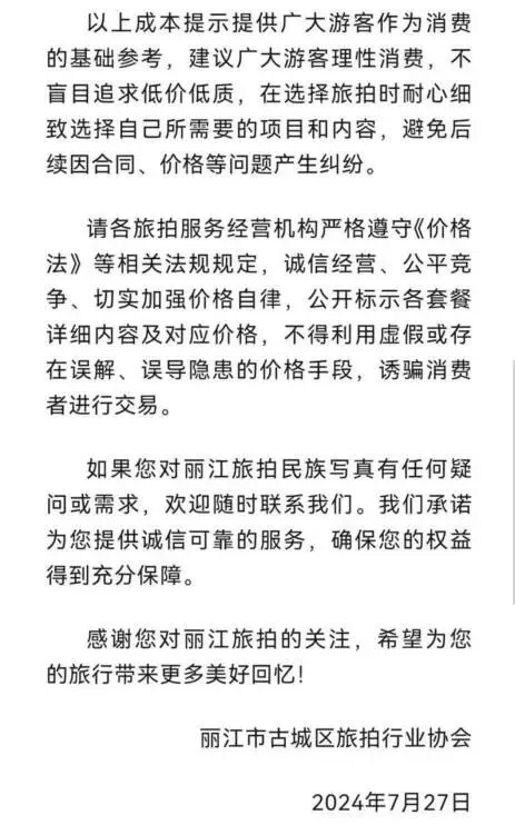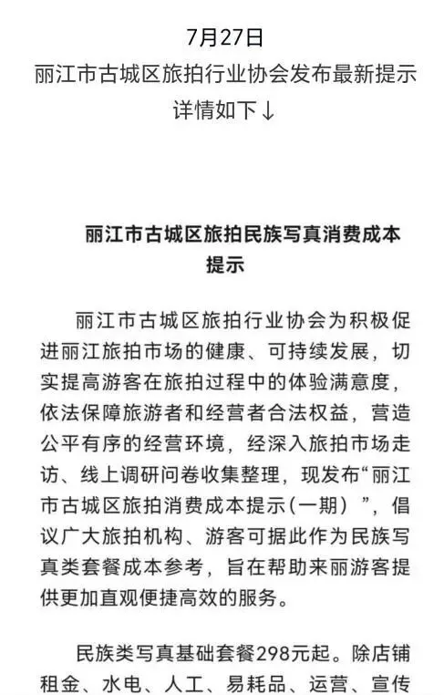 而丽江市古城区旅拍行业协会在2024年7月27日发布了《丽江市古城区旅拍民族写真消费成本提示》,指出民族类写真基础套餐成本应在298元起,建议广大游客理性消费,不要盲目追求低价。同时,要求各旅拍服务经营机构诚信经营,不得利用虚假或存在误解、误导隐患的价格手段诱导消费者进行交易。