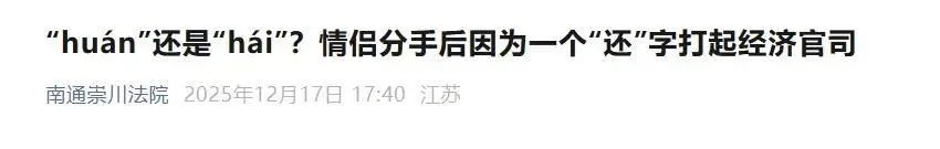 情侣分手反目“我还给了你60000元”,“还” 字到底是读 “huán”还是 “hái”?近日,江苏南通崇川法院披露一起案件……