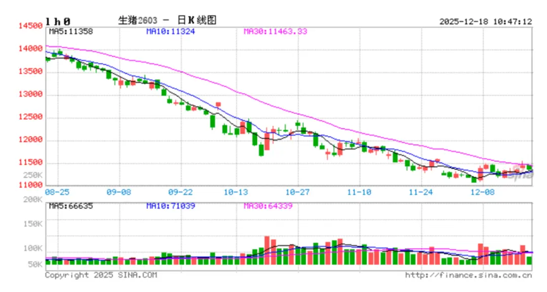 与蔬菜形成鲜明对比的是,猪肉价格持续低迷。一斤猪五花肉11元,一斤排骨20元,腿肉一斤8元。农业农村部数据显示,2025年11月最后一周,生猪平均收购价格为13.11元/公斤,环比下降0.9%,同比下降27.0%,到了12月第二周,这个价格已经变成了11.81元/公斤,环比连续5周下跌。