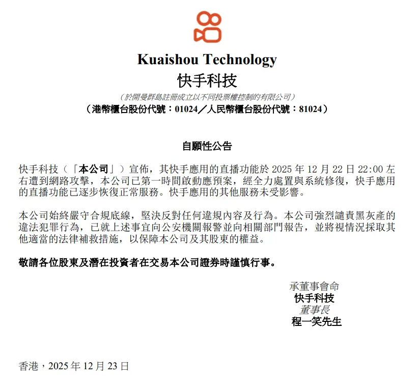 截至12月23日凌晨2点,快手才完成系统修复与违规内容清理,直播功能陆续恢复正常。随后,平台方面将情况上报给相关部门,并向公安机关正式报案。
