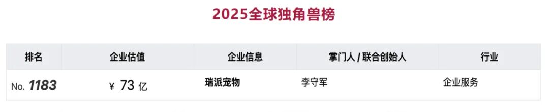 今年6月,胡润研究院发布的《2025全球独角兽榜》中,瑞派宠物以73亿元的估值上榜。