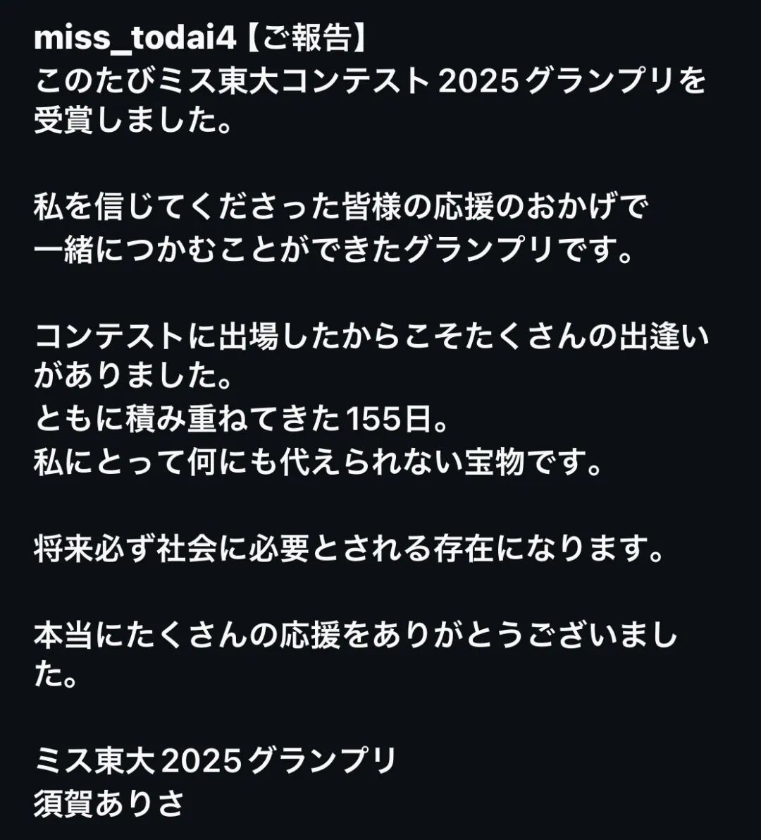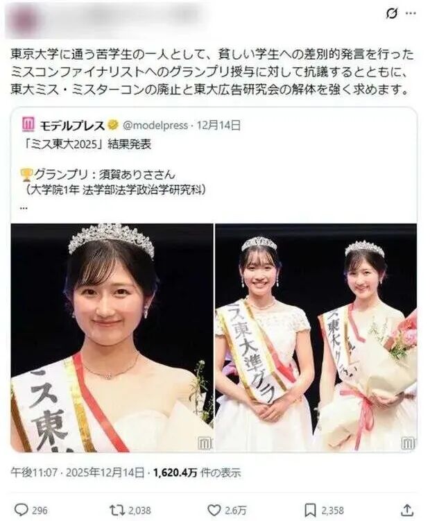 众所周知,日本最爱搞各种评选。刚好,最近是评选“东大校花”的时期。相关话题在日本网络上引发了极大争议。焦点人物正是刚刚夺得“东京大学2025年度Miss Contest冠军”的法学政治学研究科一年级学生须贺ありさ。