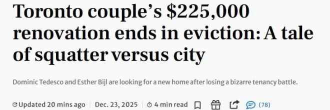 来源链接:https://www.thestar.com/news/gta/toronto-couples-225-000-renovation-ends-in-eviction-a-tale-of-squatter-versus-city/article_022eb80b-bffe-43ec-b85a-48c7c0774328.html