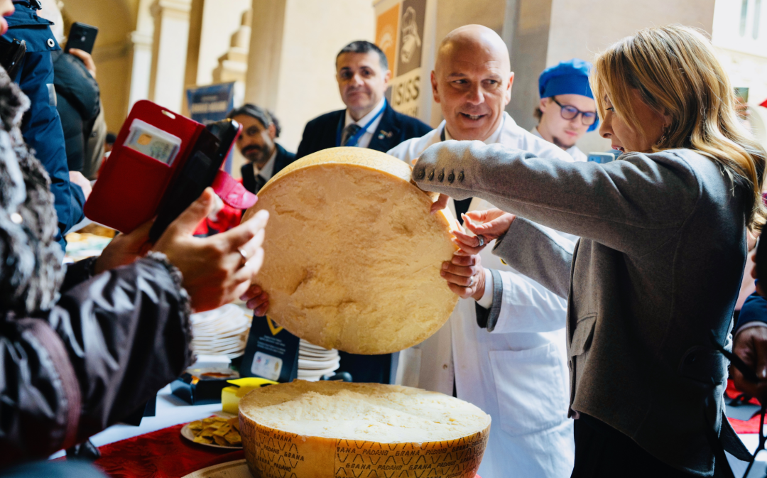 讲话结束后,现场端上了一款大号圣诞蛋糕,并配有丰盛的自助餐,提供了来自艾米利亚地区的库拉泰洛火腿(culatello)、科帕火腿(coppa),以及坎帕尼亚大区的环形脆饼(tarallo)、帕努奥佐面包(panuozzo)、水牛马苏里拉奶酪(mozzarella di bufala)等地方特色美食。