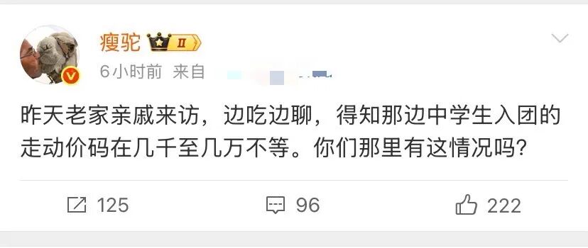 据朋友反馈的最新信息,山西某地运作一位中学生入团的价格约5000元,另一城市则行情过万,最高的达到了6万元……