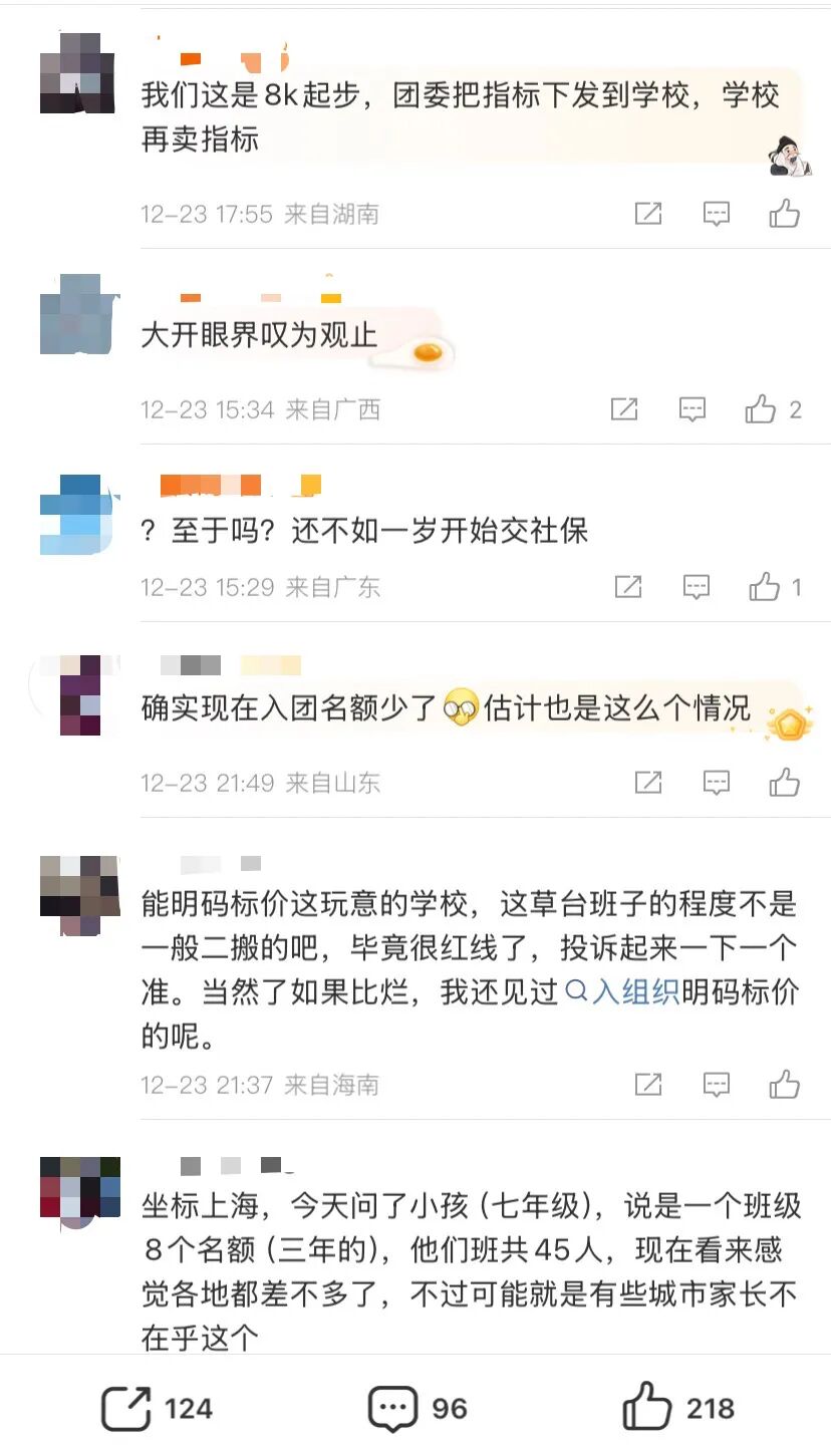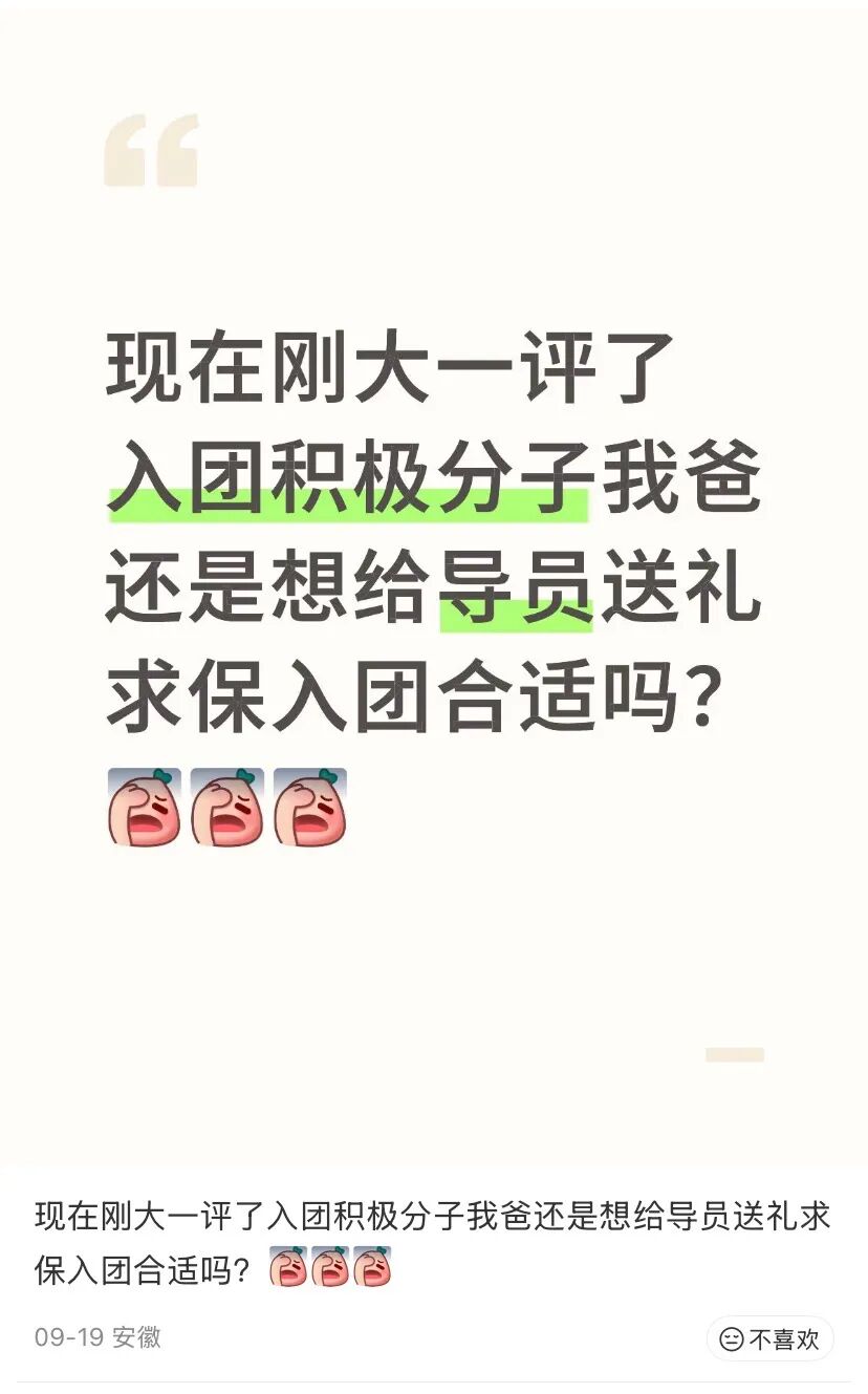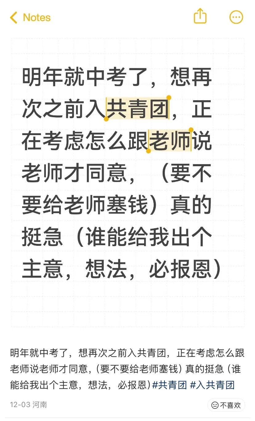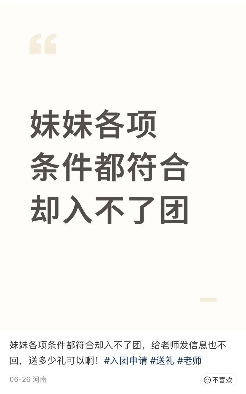 入队是为了入团,入团是为了入党,入党是为了考公考编然后为人民服务。以前入团名额没有限制,高中生几乎人人都是团员,早一年晚一年没什么差别,自然没人去花钱找关系。现在入团名额成了稀缺品,想早早为孩子考公铺路的家长自然就动起了歪心思,用起了钞能力。