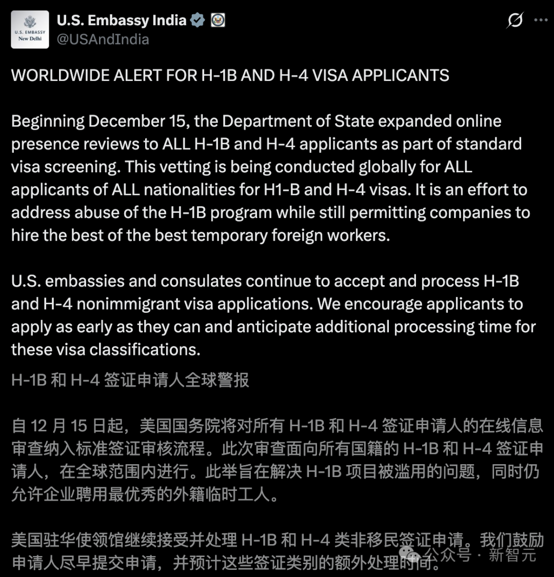 12月15日,美政府对H-1B签证持有人实施强制「社交媒体审查」(online presence review)。