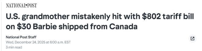 一份原本只值30加元、从加拿大寄往美国的圣诞礼物,却因为报关小数点错位,意外触发美国对加拿大商品的关税,最终让收件人收到了一张高达802美元的账单。一只芭比娃娃,差点变成“天价礼物”。图源:National Post