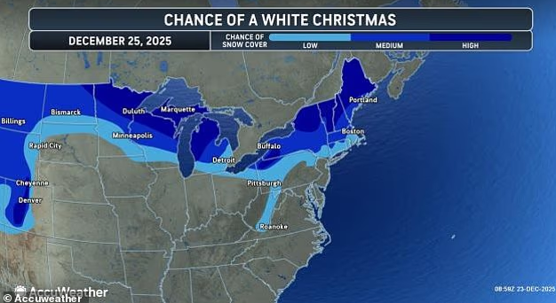 虽然周四大部分地区的降雪量预计不会太大,但缅因州、新罕布什尔州、佛蒙特州、纽约州、密歇根州、威斯康星州、明尼苏达州以及宾夕法尼亚州西北部,被列为2025年“白色圣诞”概率较高的地区。