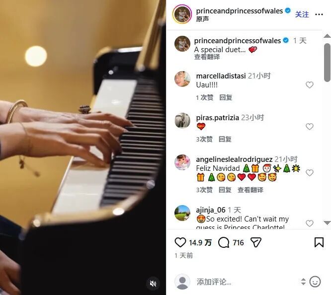 第二段预告是一小段视频,出现了钢琴和一双弹琴的手,左手的无名指上戴着那枚著名的蓝宝石订婚戒指,能看出是凯特,文案是:“一段特别的二重奏......”