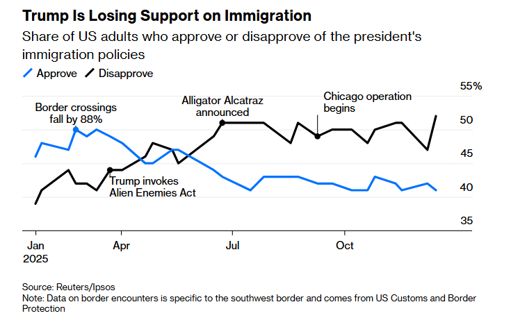 本文刊发在彭博,作者帕特里夏·洛佩兹是彭博社专栏作家,主要报道政治和政策。她曾是《明尼阿波利斯星论坛报》的编辑委员会成员。在2025年大部分时间里,特朗普挥霍了公众在他最具优势议题上的支持,移民。确实,他迅速兑现了承诺,加强了美墨边境的管控。但随着时间推移,他的反移民政策走到了多数美国人难以接受的极端一面。特朗普声称美国正遭“入侵”。3月15日,他援引《敌国侨民法》为借口,将200多名委内瑞拉人遣送至萨尔瓦多的CECOT监狱,并宣称他只遣返暴力罪犯。