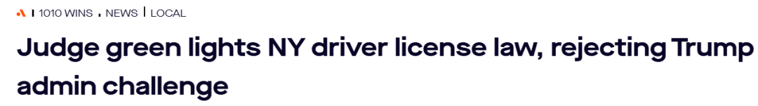 据1010WINS 12月24日报道 周二,一名联邦法官批准了纽约州备受争议的所谓“绿灯法案”(Green Light Law),驳回了川普政府试图阻止纽约州向无法证明其合法居留身份者发放驾照的请求。来源:1010WINS报道截图